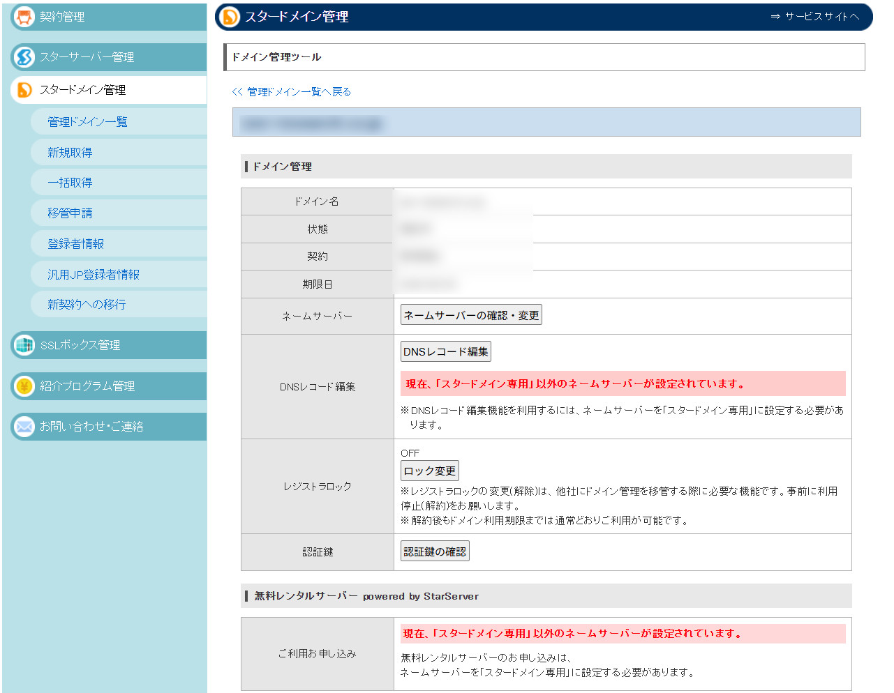 「現在、「スタードメイン専用」以外のネームサーバーが設定されています。
